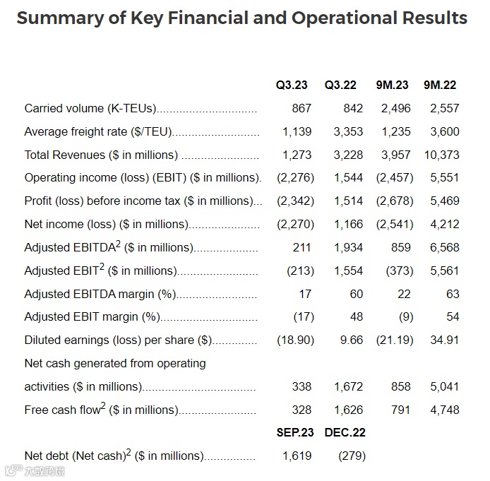 2023年前9个月的总营收为39.57亿美元,而2022年前9个月的总营收为103.73亿美元,主要是由于运费下降。