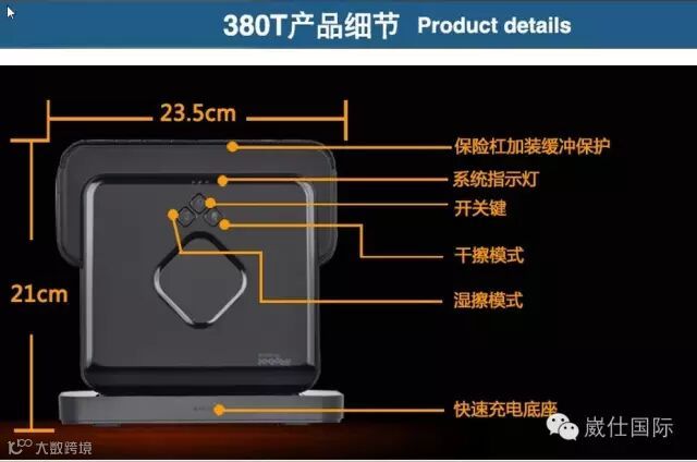 iRobotBraava 380t 干湿两用,可连续3小时扫地除灰和2小时的湿布拖地。采用了EvolutionRobotics的第二代NorthStar®北极星智能导航系统,是这款擦地机器人的大脑,帮助其识别家中环境,既避免重复作业又不遗漏任何角落,极大的提高了清洁效率。2小时快充底座。内置防震系统,高低落差的地板依然可以顺利进行清扫工作。工作时噪音极低,打扫完毕或电力耗尽时,它会返回打扫的起始位置,一台机器干擦,湿擦两种用法,性价比高。110-240V全球通用电压,国内可正常使用。具有静音、耗材成本低、体积小巧等优点。