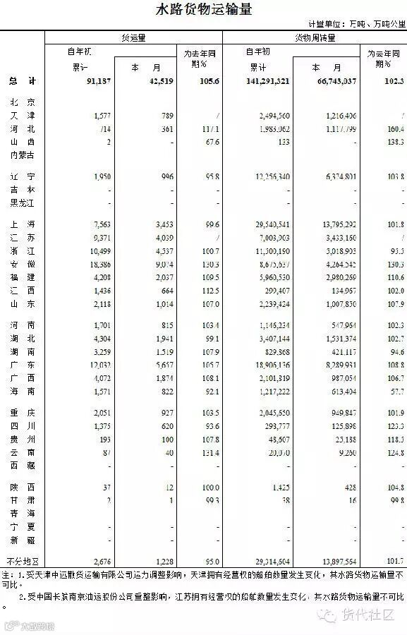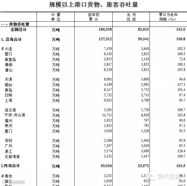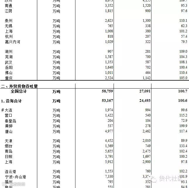 2016年2月份,全国规模以上港口吞吐量82913万吨,其中沿海合计59341万吨,内河合计23572万吨。2016年以来: 全国规模以上港口吞吐量累计180338万吨,累计为去年同期101.0%; 全国外贸货物吞吐量58759万吨,累计为去年同期100.7%; 全国集装箱吞吐量3240.72万吨,累计为去年同期100.2%。 2016年2月份,全国水路货运量42519万吨,全国水路货运周转量66743.037万吨。 2016年以来:全国水路货运量累计91187万吨,累计为去年同期105.6%;全国水路货运周转量累计1412913217万吨,累计为去年同期102.3%。