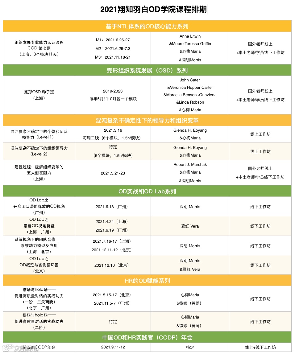 2021年OD学院的新一年课表已揭露其神秘面纱,众望所归的组织发展专业能力认证课(COD)日期一经发布,就在群里激起千层浪。很多小伙伴纷纷联系小编,来确认COD课程的详细事宜。