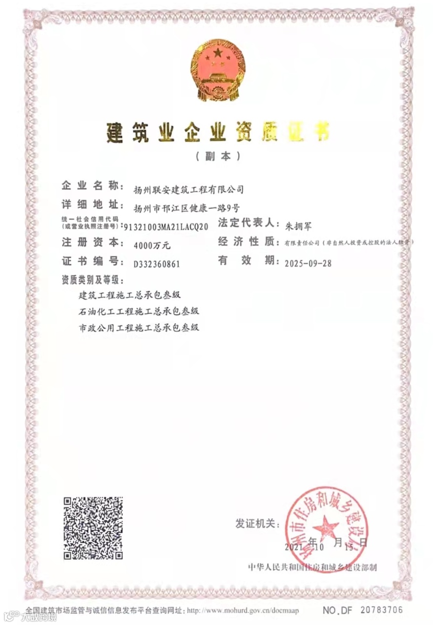 近日,扬州联通医药设备有限公司的全资子公司扬州联安建筑工程有限公司顺利通过中华人民共和国住房和城乡建筑部的各项审核,成功取得“建筑工程施工总承包叁级”、“石油化工工程总承包叁级”、“市政公用工程施工总承包叁级”资质证书。