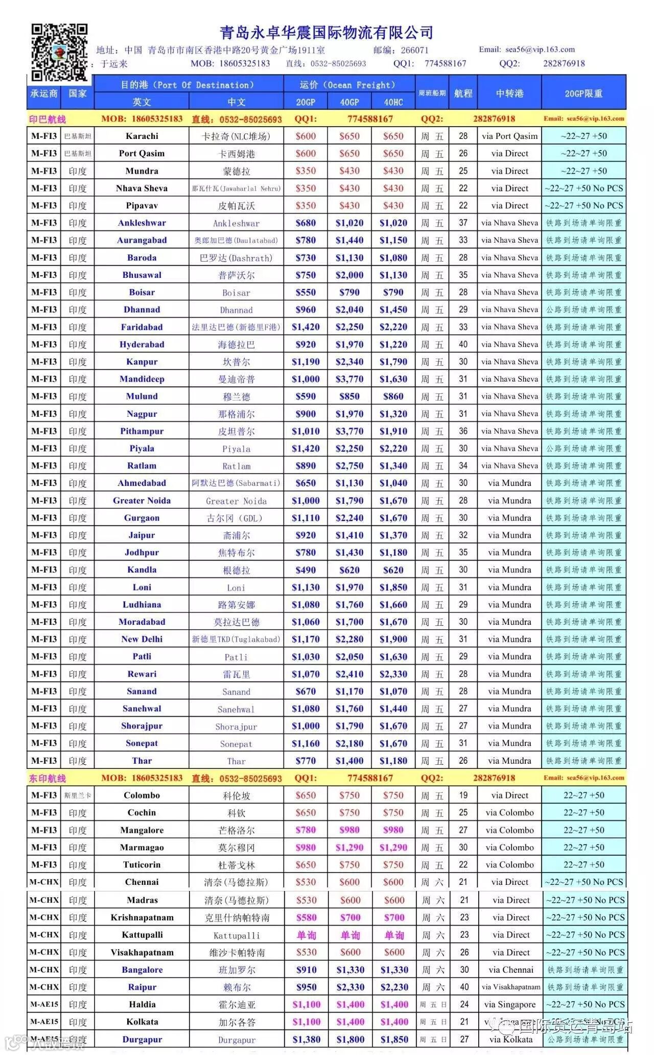 WEEK 51 印度航线 那瓦蒙的拉340/400 卡拉奇590/620 清奈 维萨卡520/580 加尔各答1100/1380