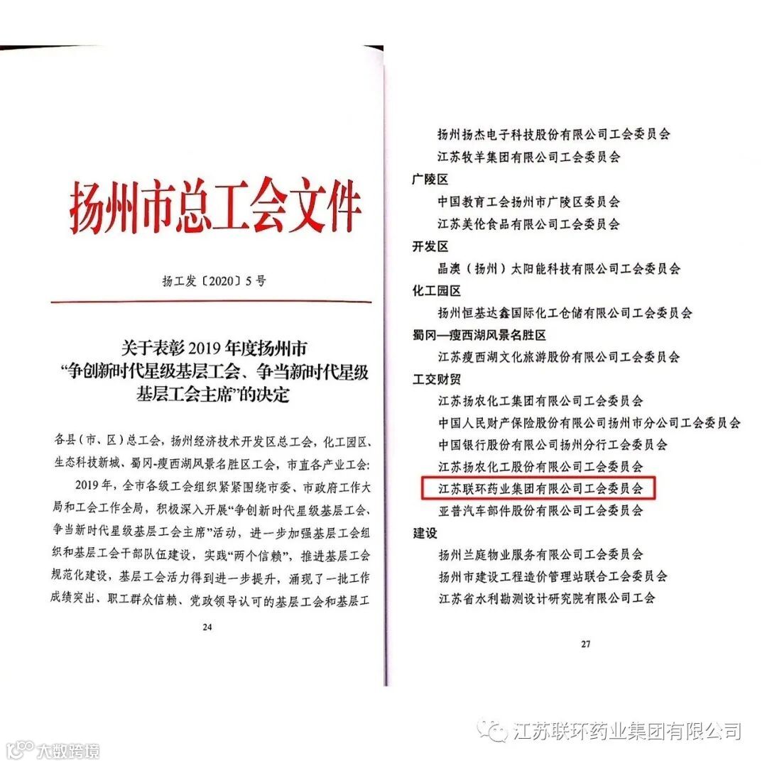市总工会表彰了一批2019年度争创“新时代星级基层工会”的单位及个人。江苏联环药业集团有限公司工会荣获“新时代五星级基层工会”荣誉称号。