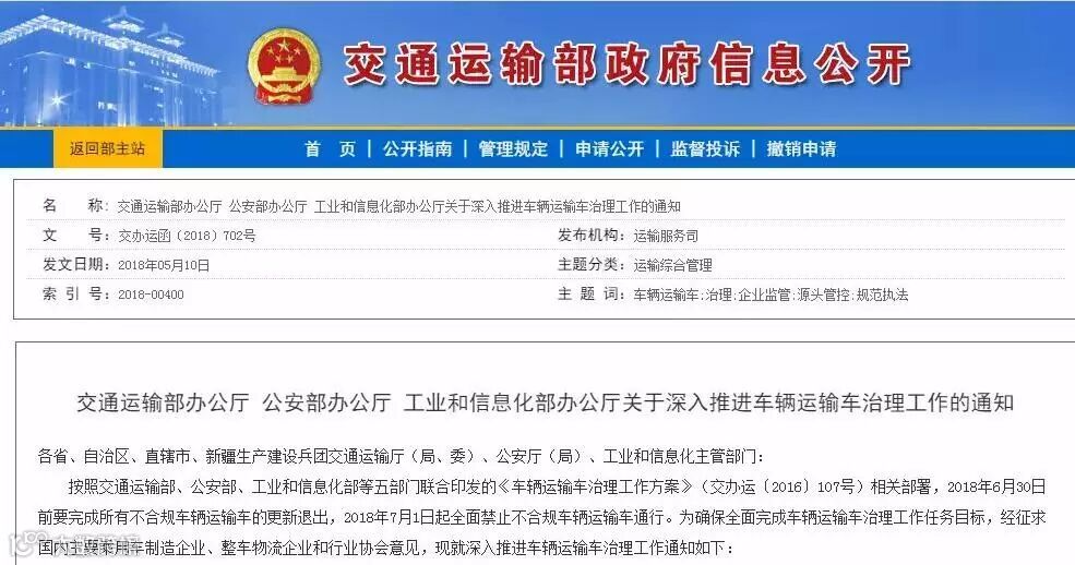 为确保全面完成车辆运输车治理工作任务目标,5月10日,交通运输部办公厅、公安部办公厅、工业和信息化部办公厅发布了关于深入推进车辆运输车治理工作的通知。