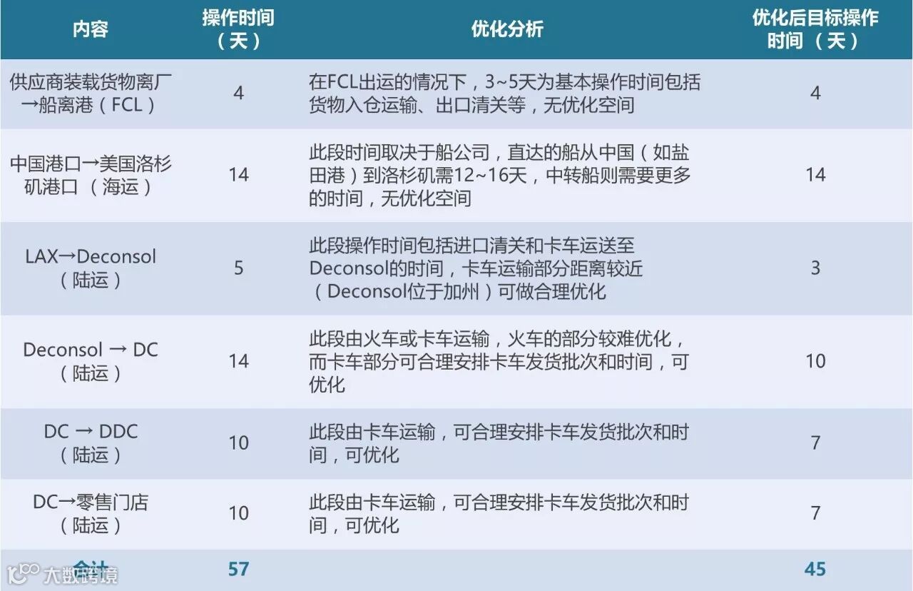 首先需要判断哪些时间是可以节省的,哪些时间是无法节省的。表1对两种运输模式下的可能时间节省机会进行了归纳。从表中可以看出,在FOB(Free On Board船上交货价)条款下,国内端的全程运输时间基本上没有机会。在美国端,由于其时间占比高,存在不少优化机会。如通过合理的发货批次,可以减少公路的运输时间。使得总运输时间从原先的57天,下降为45天,时间效率提升21%。当然,这不仅是时间成本的减少,更重要的会带动库存成本、销售预测的成本下降。