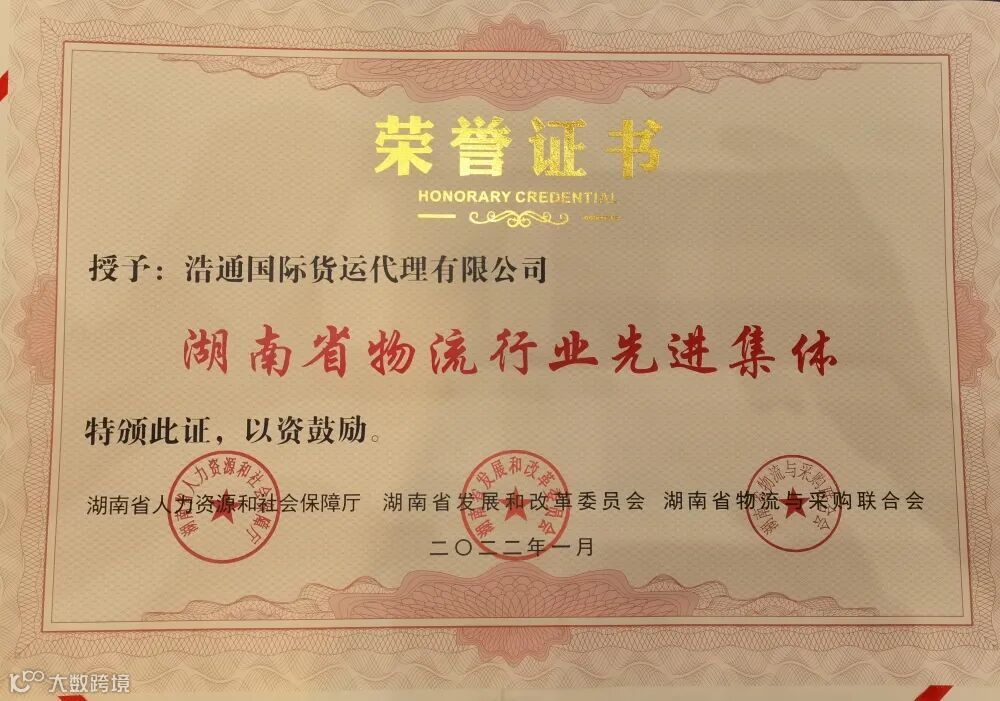 热烈祝贺浩通国际荣获“湖南省物流行业先进集体”称号