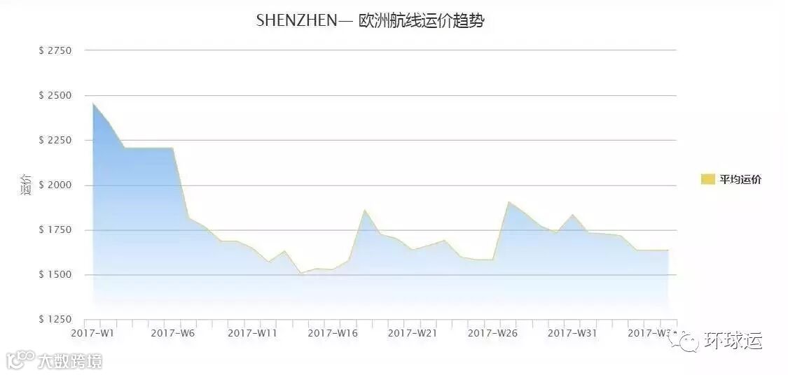 根据搜航官网运价趋势图显示,2017年第1周至第36周(1月1日—9月1日),从深圳三大港口至欧洲的航线运价都出现了大幅下跌。