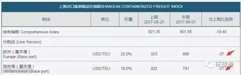 根据上海航运交易所公布的数据显示,2017年8月25日—2017年9月1日,上海出口至欧洲运费一周跌去了 USD 37/20' & USD74/40'