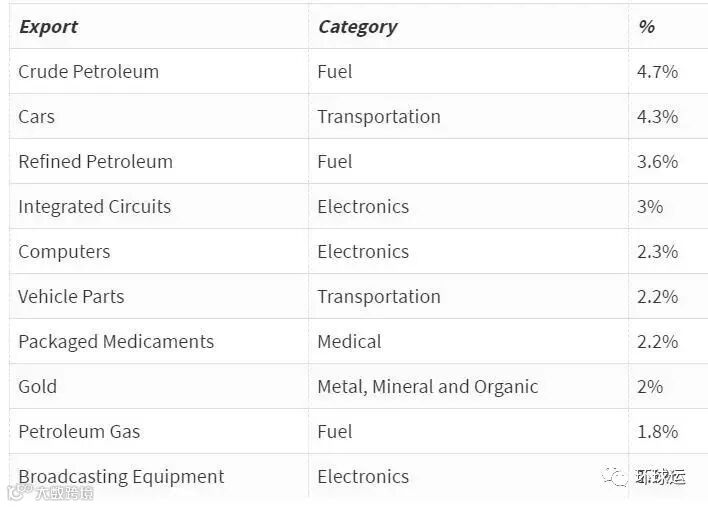 原油、汽车、精炼油、集成电路、计算机、汽车部件、成品药、黄金、天然气和无线设备。