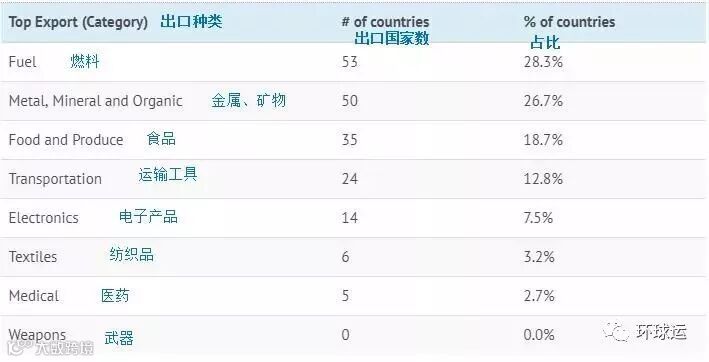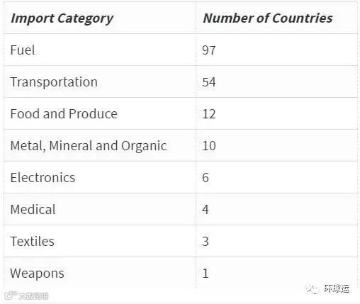 从进口方面看,全球有97个国家在全球贸易中进口了燃料,进口比重居第二的是交通运输工具。
