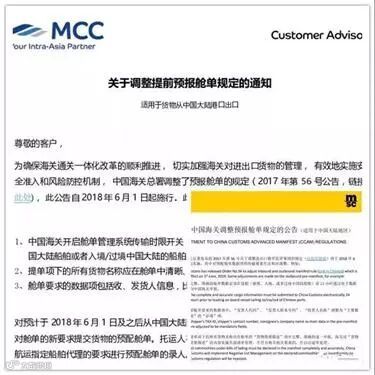 对预计于2018年6月1日及之后从中国大陆装载出口的货物,船公司将遵守中国海关对舱单的新要求提交货物的预配舱单。托运人在向出口地海关申报货物之前,应按照船公司指定船舶代理的要求进行预配舱单的录人。