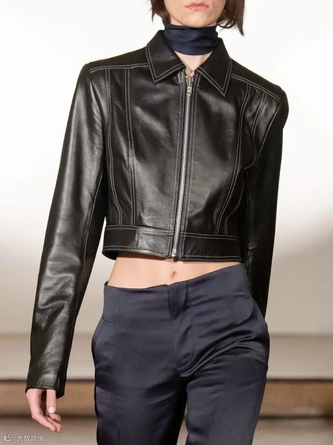 新型极简皮夹克总体也遵循了极简干脆的手法语言,直挺流畅的剪裁廓形,轻便又率性,而通常又会在领型等细节上放大比例,强调皮夹克结构本身的立体感和风格效果的利落性。