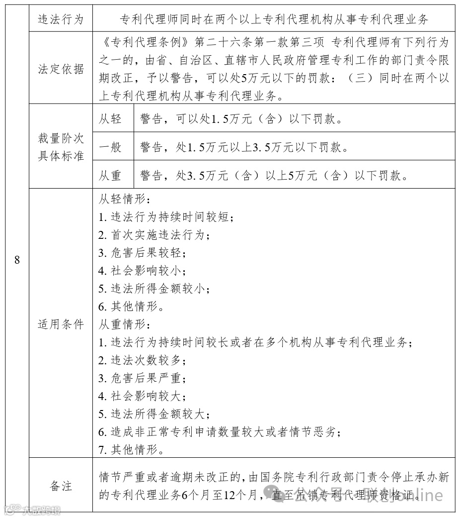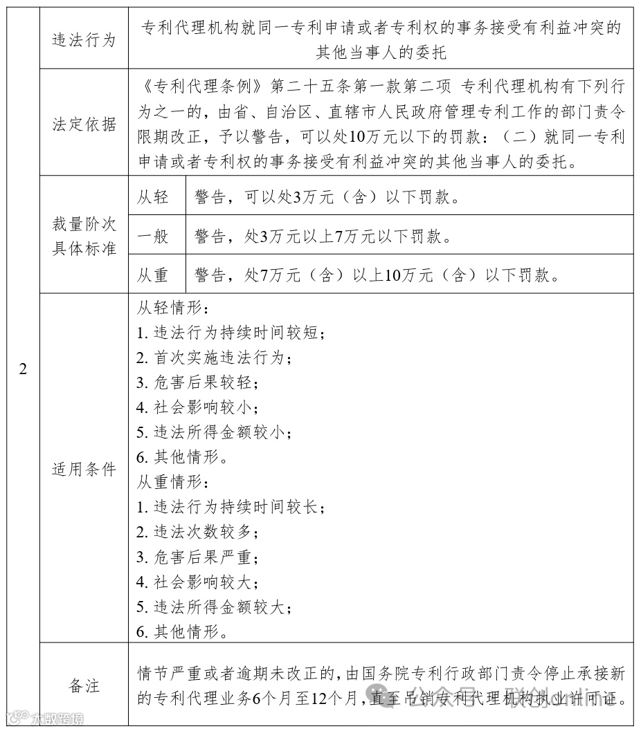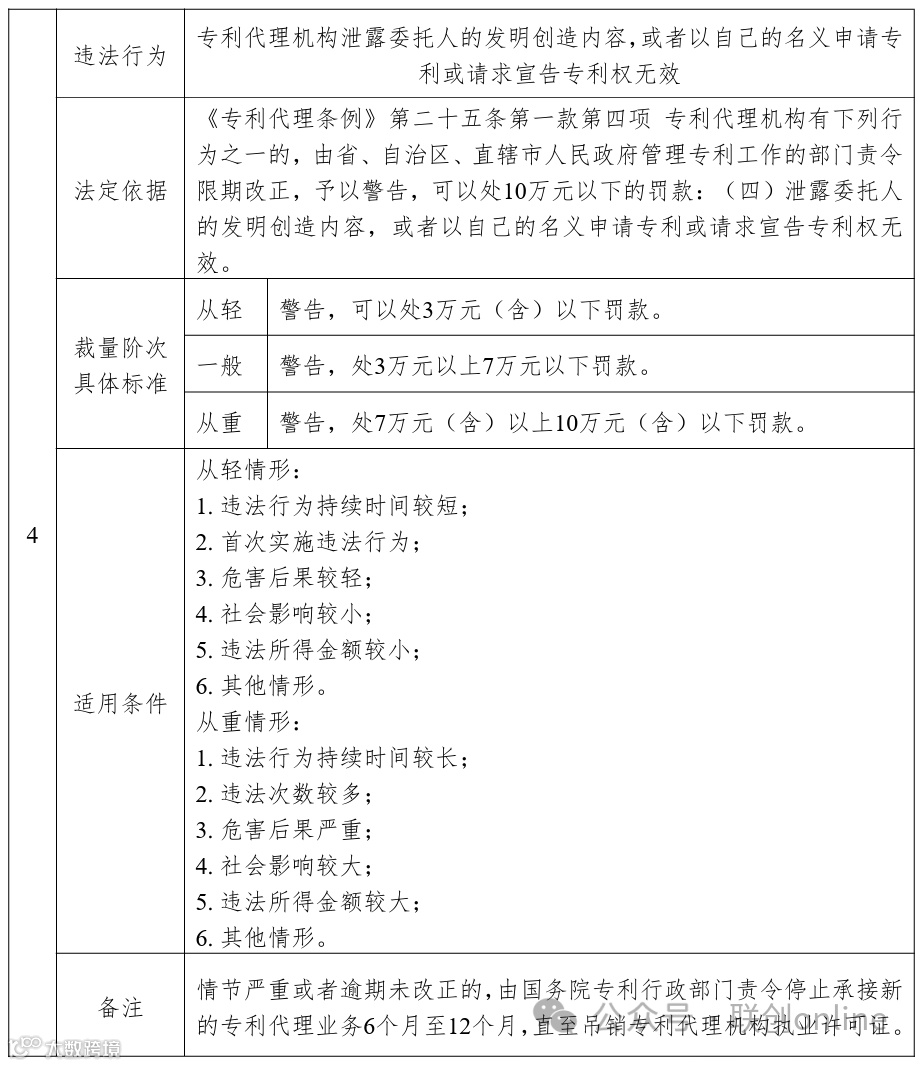 《基准》以表格形式对《专利代理条例》中规定的11项违法行为的相关行政处罚标准进行了细化,主要内容包括违法行为、法定依据、裁量阶次具体标准、适用条件和备注五个部分。其中,裁量阶次具体标准统一分为从轻、一般和从重阶次,并对具体行政处罚标准进行了计算和细化,关于裁量阶次的含义、情形及其适用,按照《中华人民共和国行政处罚法》等法律、法规、规章和上级规范性文件的相关规定执行,本基准不做重复表述。适用条件主要区分从轻情形和从重情形,主要包括违法行为持续时间、违法所得金额、危害后果、社会影响程度等,结合专利代理行政处罚案件特性,特别将造成非正常专利申请数量较大或者情节恶劣的作为部分违法行为的从重情节。在注释部分,对《专利代理条例》有关条款提及“情节严重”的情形作出了规定。