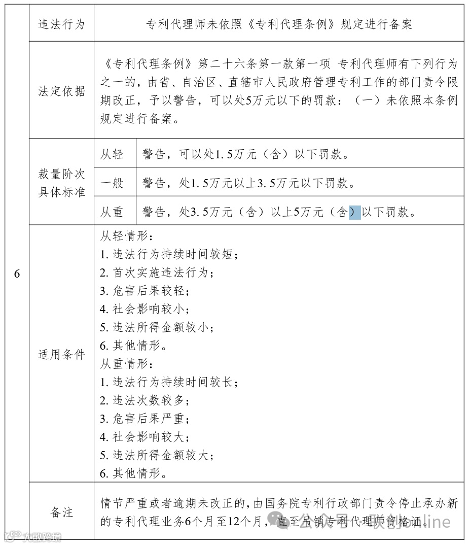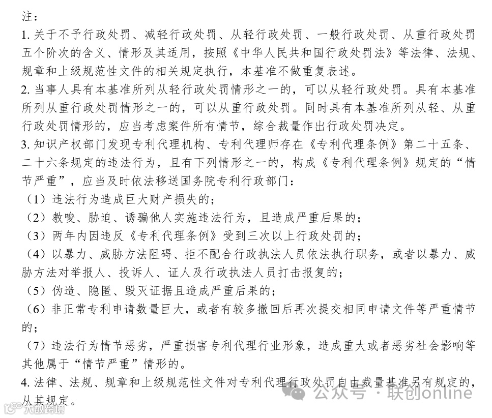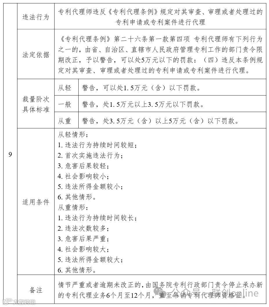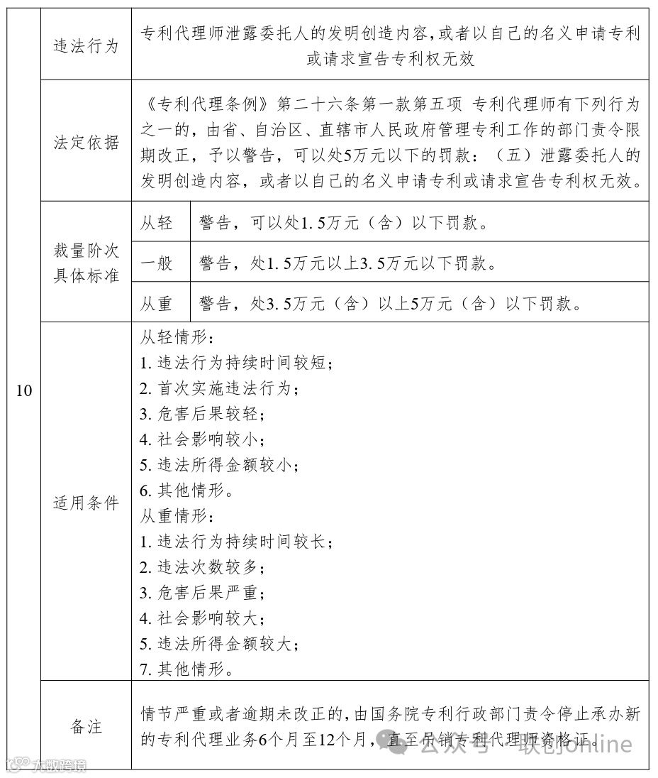 《基准》以表格形式对《专利代理条例》中规定的11项违法行为的相关行政处罚标准进行了细化,主要内容包括违法行为、法定依据、裁量阶次具体标准、适用条件和备注五个部分。其中,裁量阶次具体标准统一分为从轻、一般和从重阶次,并对具体行政处罚标准进行了计算和细化,关于裁量阶次的含义、情形及其适用,按照《中华人民共和国行政处罚法》等法律、法规、规章和上级规范性文件的相关规定执行,本基准不做重复表述。适用条件主要区分从轻情形和从重情形,主要包括违法行为持续时间、违法所得金额、危害后果、社会影响程度等,结合专利代理行政处罚案件特性,特别将造成非正常专利申请数量较大或者情节恶劣的作为部分违法行为的从重情节。在注释部分,对《专利代理条例》有关条款提及“情节严重”的情形作出了规定。