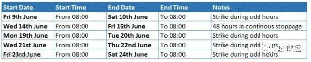 Algeciras阿尔赫西拉斯19艘;Valencia瓦伦西亚7艘:Barcelona巴塞罗那6艘;Vigo比戈2艘!你中招了吗? 刚刚更坏的消息是罢工会持续到7月,时间表如下,料会有更多船公司放弃西班牙码头而转靠。