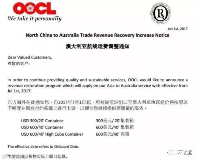 环球运OOCL发布澳大利亚航线运费调整通知,自2017年7月1日起,所有从亚洲出口至澳大利亚地区运价将按照相关幅度在原有合约基础上进行上调。