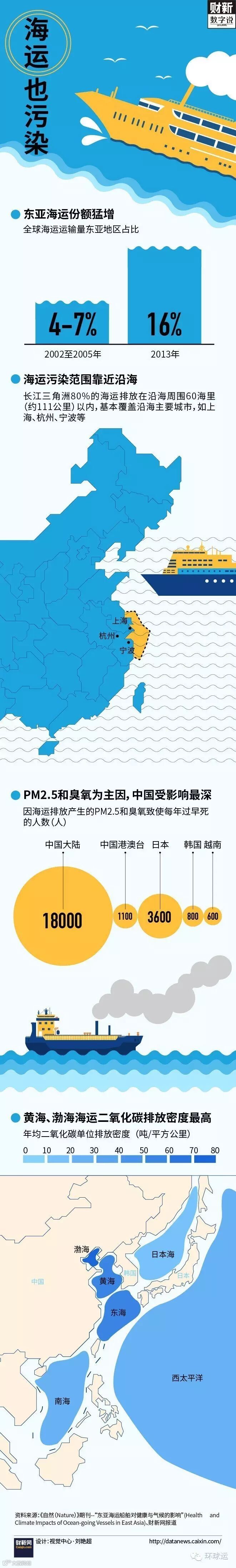 海上船运产生的PM2.5颗粒物(雾霾主要因素)和臭氧是影响人们健康的主要原因。东亚地区每年这两类污染物可导致早死的人数平均估计约24000人。其中,中国大陆有18000人,日本3600人,港澳台地区有1100人。其次是韩国和越南,分别有800和600人。