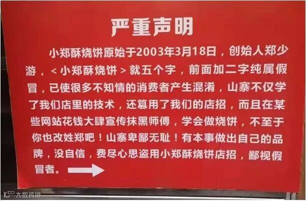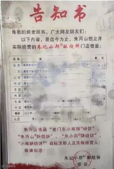 两家店因“小郑酥烧饼”纷争上演,左边贴起了严重声明,右边立起了告知书。