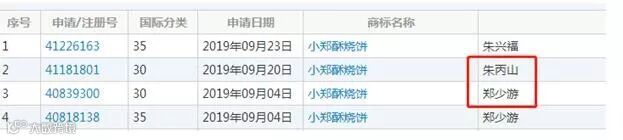 ,随后相继申请的还有“朱小郑酥烧饼”“朱记小郑酥烧饼”等商标。