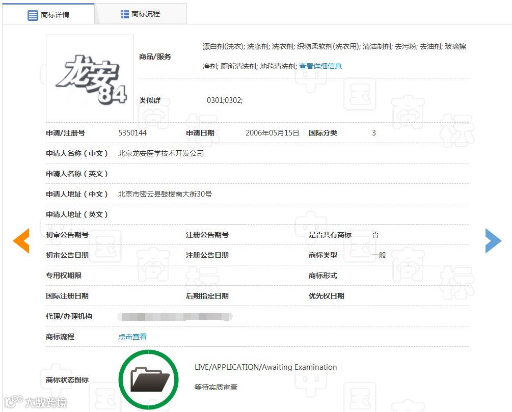 5350144号第3类“龙安84”商标目前还处于等待实质审查状态,该商标指定使用于洗涤剂、洗衣剂、清洁制剂等。