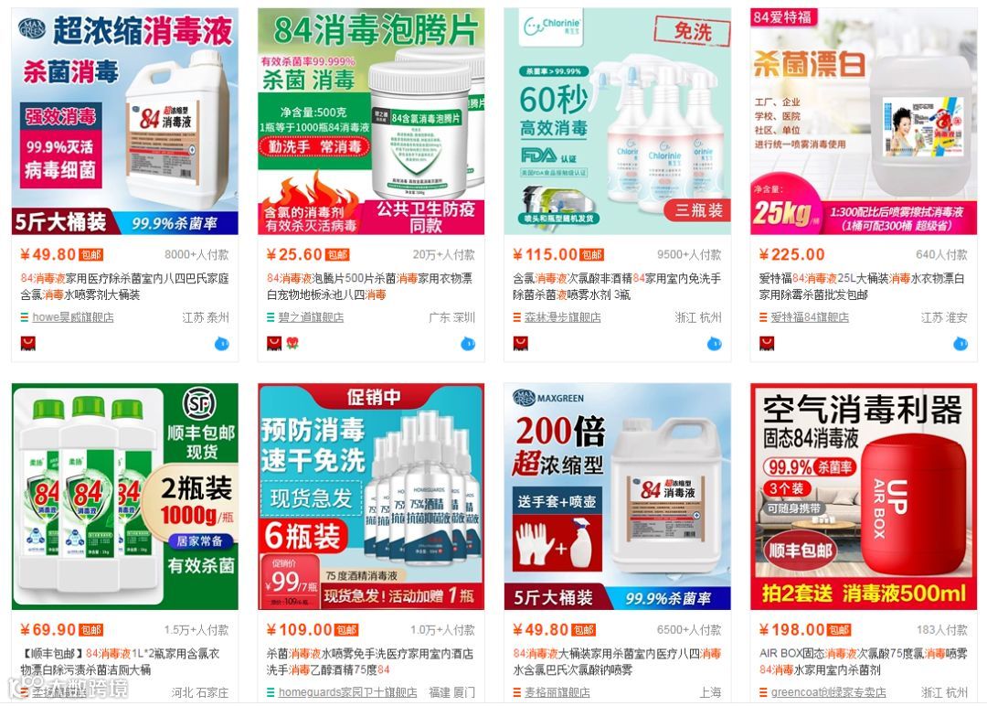 30多年来,84消毒液一直在消毒方面口碑不错。可是,在电商平台上进行“84消毒液”搜索时,页面上出现了各式各样的消毒液产品。