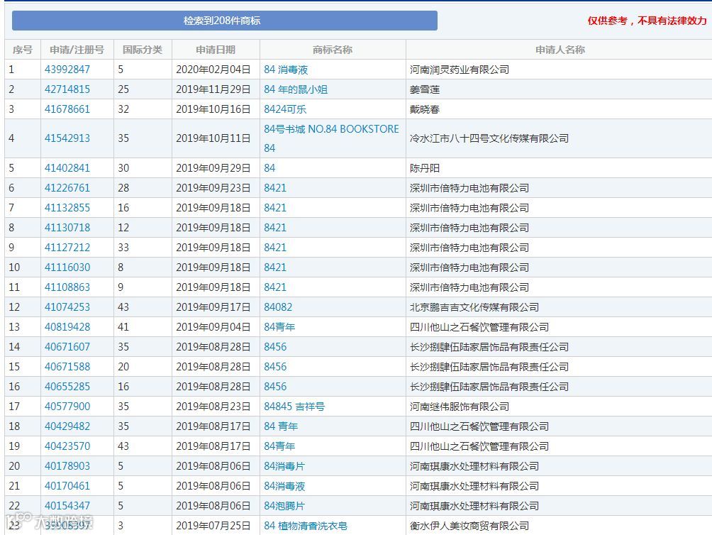 据商标网查询,,含有“84”字样的商标有200多件,其中“84”商标只有20多件,有些已经被驳回。