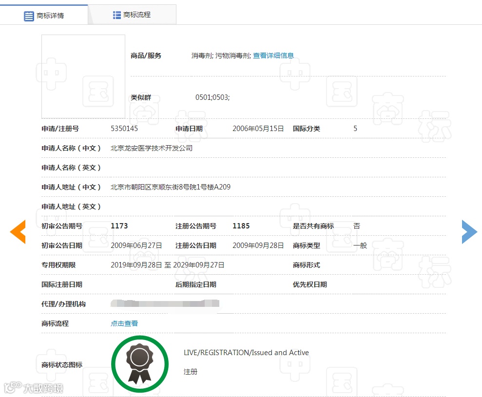 5350145号第5类“龙安84”商标注册成功,该商标指定用于消毒剂、污物消毒剂等商品。