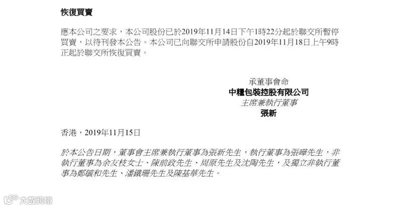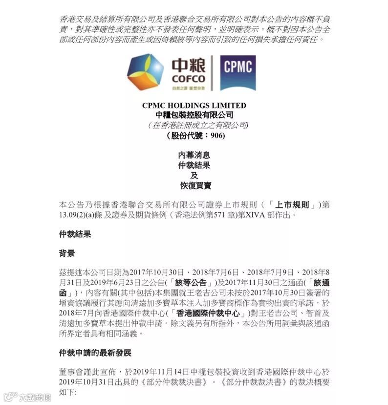 11月15日晚,中粮包装(00906)发布公告称,公司于11月14日收到了香港国际仲裁中心在2019年10月31日出具的《部分仲裁裁决书》(下称“裁决书”)。