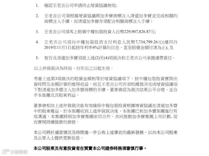 裁决书内容显示:确认王老吉公司(加多宝商标的持有公司)申请终止增资协议无效;王老吉公司须根据增资协议将加多宝商标注入清远加多宝并完成相关的商标注入手续,而清远加多宝亦须配合相关商标注入手续;王老吉公司须马上赔偿中粮包装投资约人民币2.30亿元(人民币,下同);王老吉公司须向中粮包装投资支付利息约人民币773.48万元(连同自 2019年11月1日起按年利率4%计算的日息,直至赔偿金额付清为止);智首及清远加多宝须就上述(2)至(4)项裁决和王老吉公司承担连带责任。