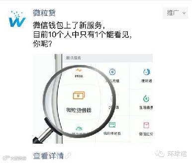 去年五月份,腾讯旗下微众银行推出了“微粒贷”产品,之前在QQ钱包中已上线,而今日,该功能正式入驻微信,朋友圈已经放出了广告,号称10个人中只有一个人才能看见,你们可以看见吗?