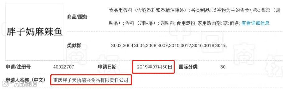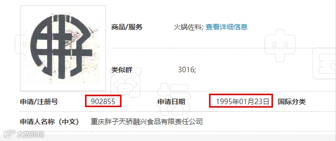 早在1995年,重庆一家专做麻辣鱼佐料的食品公司-重庆胖子天骄融兴食品有限责任公司(下称胖子公司)向国家商标局提交注册了一枚“胖子”商标,该商标在1996年被核准注册,可谓历史悠久,在当地也非常有名,还曾获得过重庆市老字号、重庆市著名商标的荣誉。