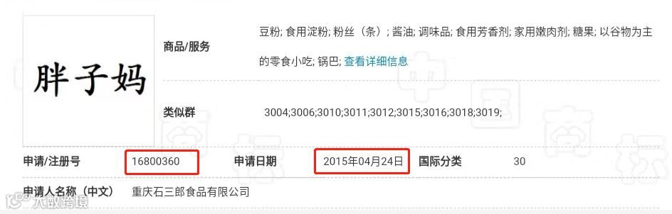 通过商标官网查询,“胖子妈”商标比“胖子”商标申请晚了整整20年,直到2015年才申请注册。