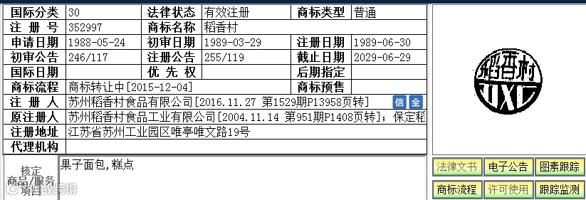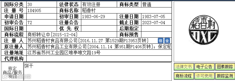 苏稻两个标分别于1983年和1989年获准注册饼干,果子面包,糕点上同属于3006小类