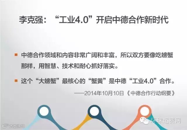 环球运费网导读:互联网+制造”就是工业4.0,它将推动中国制造向中国创造转型,所以很多人说,工业4.0是整个中国时代性的革命。工业4.0有哪些特点?有哪些技术支柱?谁最终赢得第四次工业革命主导权?本文将一一详细解答。