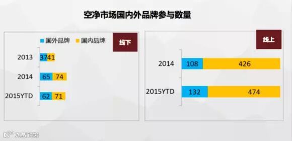 品牌竞争的加剧也将迎来空气净化器市场的首轮洗牌。中怡康的数据表明,2015年线下市场国内的空气净化器品牌数量为71个,国外品牌为62个,线上市场国内的品牌数量为474个,国外品牌则为132个。