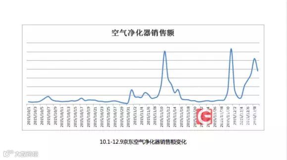 来自京东的一份销售数据显示,从10月1日到12月9日,除了双十一因产品促销出现销售高峰外,其他高峰时段均与空气质量密切相关。在11月底到12月8日北京及周边地区出现两次严重雾霾,使得京东所售的空气净化器销售额出现两次爆发性波峰。12月1日的峰值甚至超过了双十一的峰值。京东销售人员称,当天部分热销品牌甚至卖到断货,不得不由厂商从线下渠道紧急调货。
