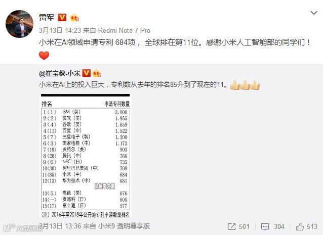 近日,小米创始人雷军在微博转发了一张“AI相关专利申请数量最多的15家企业”的数据截图,数据显示,全球AI相关专利排名中,百度、国家电网、腾讯、阿里、小米、华为等6家中国企业上榜前15名,小米位列11。