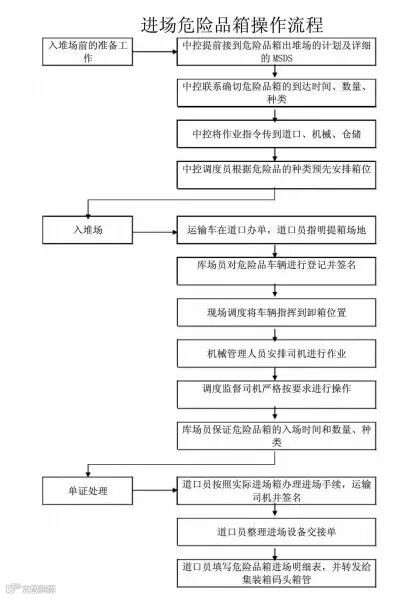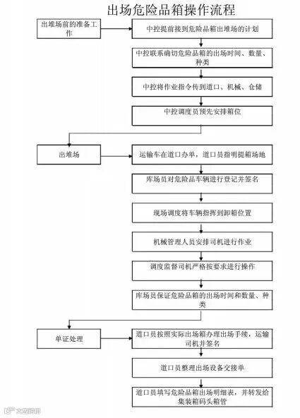 危险货物申报单由主管机关批准后,存查一份,申报人自留一份,码头一份。码头在进口业务中对船图“危险品清单”中列名的危险品箱除需审核是否有申报单外,还要审核船名、航次、始发港、货名、类别、箱型、箱量及船箱位等项目是否正确。