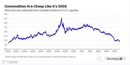 追踪24种原材料的标准普尔GSCI指数与标普500成分股的交易价之比为2002年以来最低。但如果参考此前的表现,这波下跌可能还要继续下去。