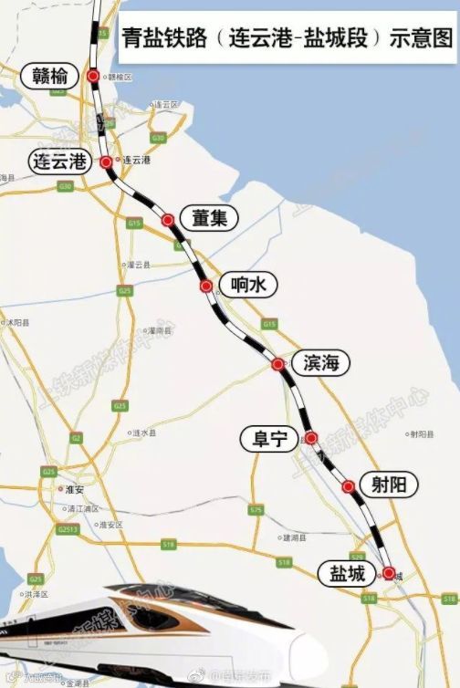 2013年开工,历经5年的建设,青盐线终于计划年底开通了。青盐线北起青岛北站、南至盐城北站,全长428km,设计行车速度200km/h。