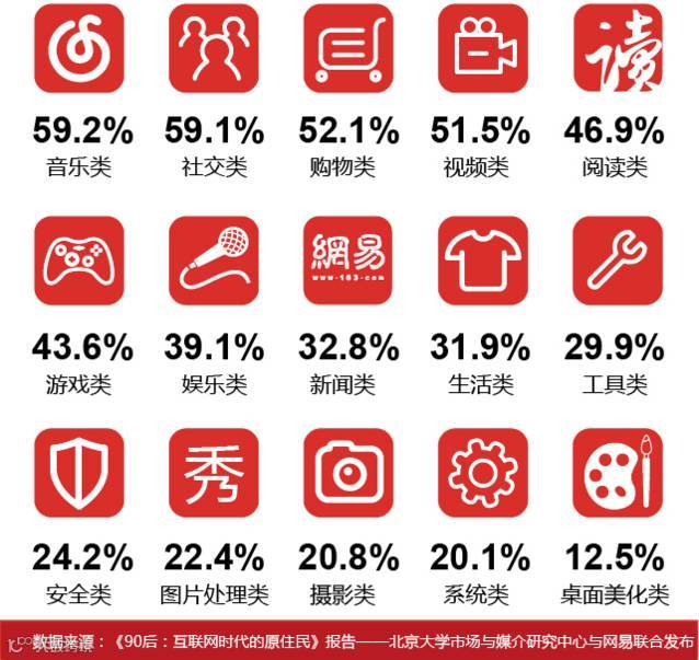 最受90后喜爱的App是音乐应用,将音乐选为特长的用户也最多,音乐成为最受欢迎的精神消费。紧随音乐的是社交App,独生子女占主流的90后生来孤独,通过社交网络可以打发时间、交朋识友,购物、视频、阅读和游戏应用的渗透率也超过了40%。这一应用类别排名与整体排名还是有很大差距的,整体上社交类、资讯类、视频类应用排名更靠前,音乐应用相对靠后。在90后中音乐应用最受欢迎,值得关注。这意味着网易云音乐等音乐App,以及唱吧为代表的表演和互动类音乐应用,在90后中有很大施展空间。