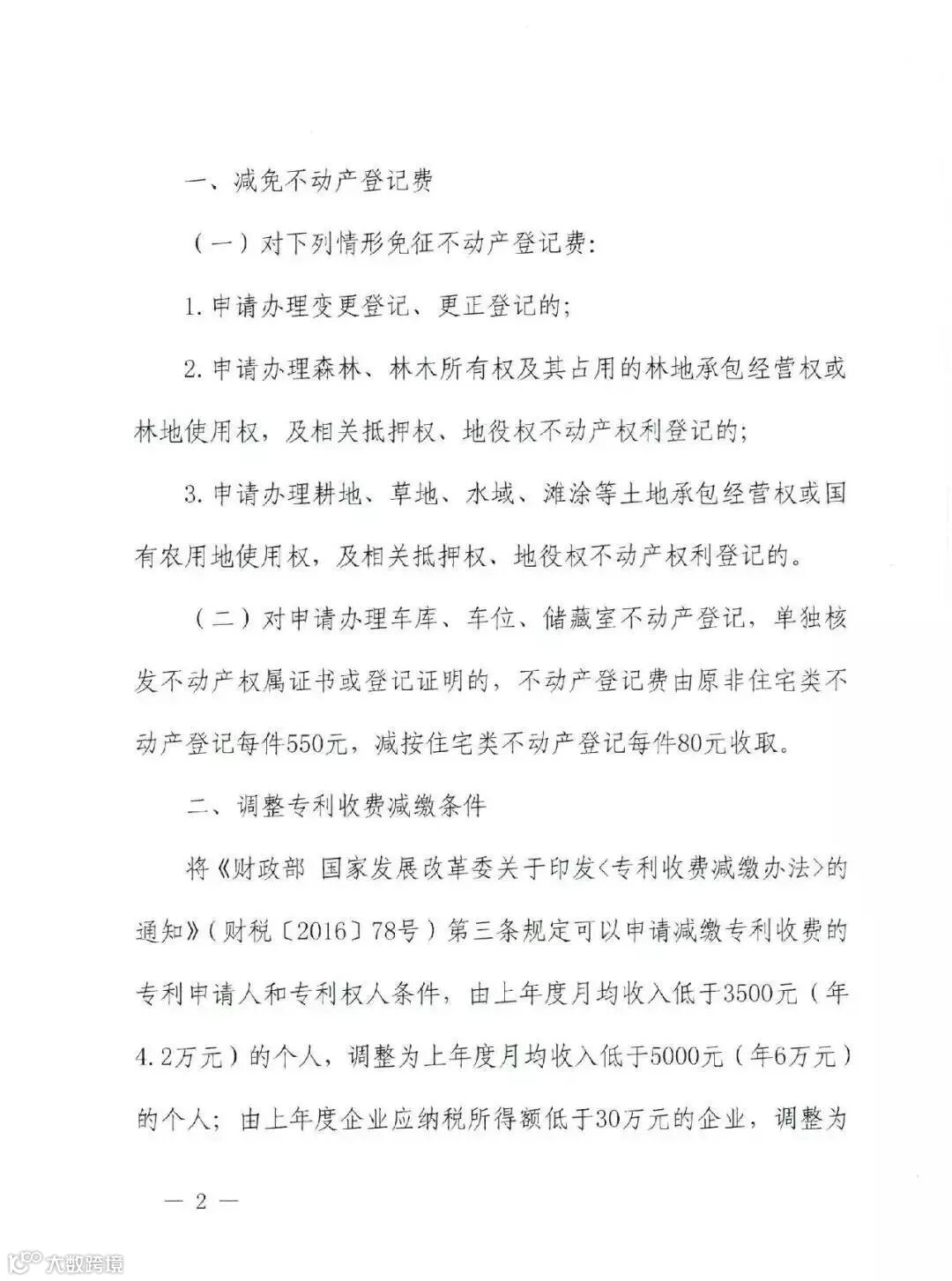 将《财政部 国家发展改革委关于印发〈专利收费减缴办法〉的通知》(财税〔2016〕78号)第三条规定可以申请减缴专利收费的专利申请人和专利权人条件,由上年度月均收入低于3500元(年4.2万元)的个人,调整为上年度月均收入低于5000元(年6万元)的个人;由上年度企业应纳税所得额低于30万元的企业,调整为上年度企业应纳税所得额低于100万元的企业。