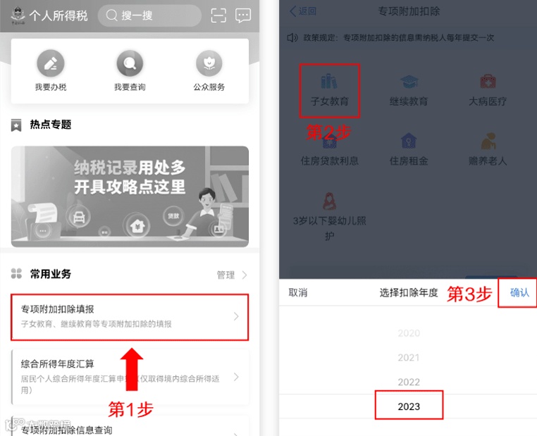 比如2023年新增子女教育扣除,需要申报填写:先按【情形一】步骤确认之前申报的其他不需修改的专项附加扣除信息后,点击APP【首页】-【专项附加扣除填报】,如下图