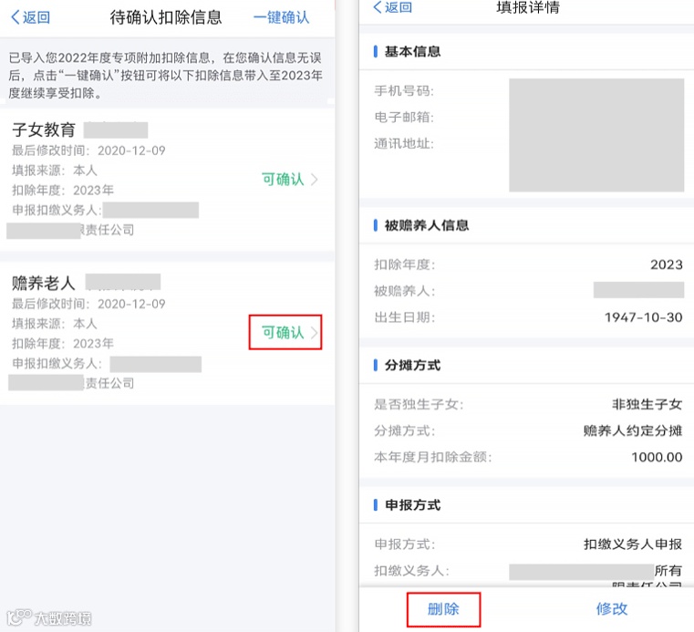 比如2023年不再申请赡养老人专项附加扣除:点击【可确认】状态的赡养老人信息,点击【删除】,点击【一键确认】