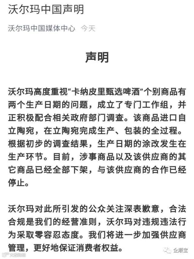 5月14日,深圳一名顾客在一款进口啤酒底部发现生产日期有被涂改的痕迹,因此怀疑沃尔玛销售过期产品,遂向当地监管部门提出申诉,沃尔玛一时成了众矢之的。