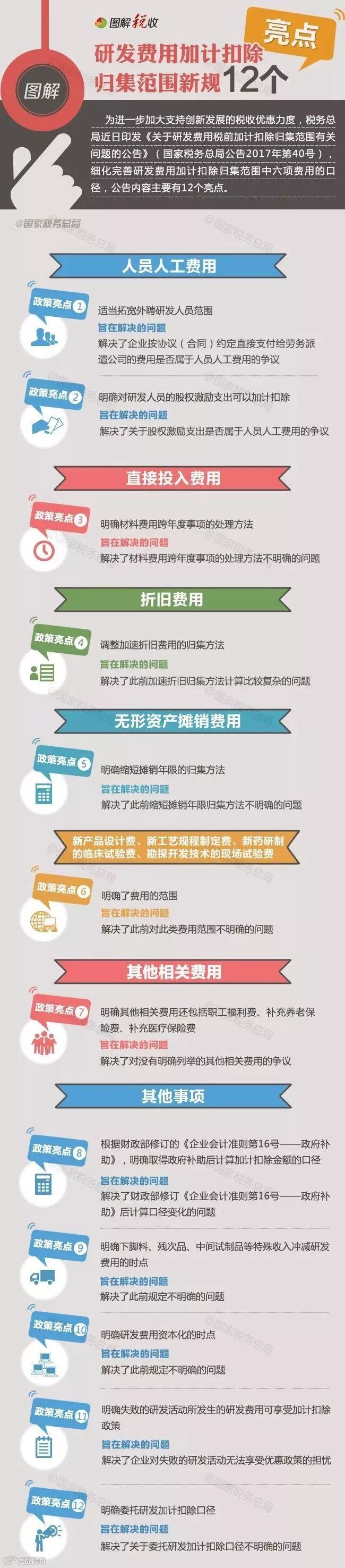 为进一步加大支持创新发展的税收优惠力度,税务总局近日印发《关于研发费用税前加计扣除归集范围有关问题的公告》(国家税务总局公告2017年第40号),细化完善研发费用加计扣除归集范围中六项费用的口径,公告内容主要有12个亮点。