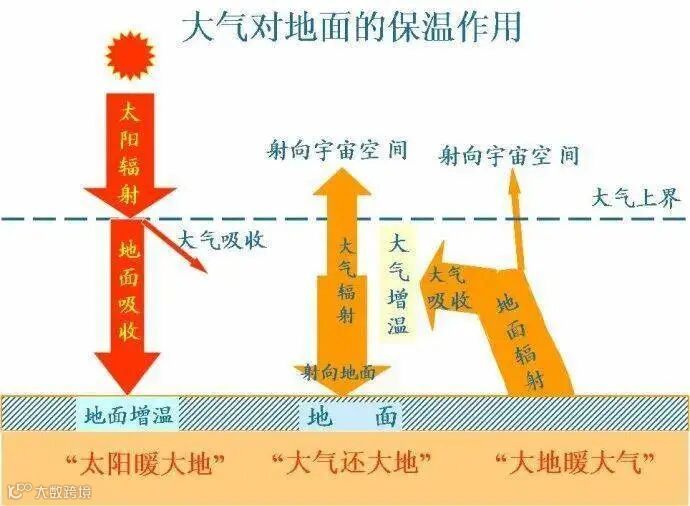 为什么呢?主要的原因是地球被浓密的大气层所包裹。太阳光并不直接加热靠近地面的空气,而是先加热地面。地面再通过红外辐射、空气对流和水分蒸发把热带给空气。每平方米的地表上面,有大约10吨的空气,可以储存大量的热。这就使地表的温度不会太高。到了晚上,这些热量又使地表的温度不致过低。这样,地球上的昼夜温差只有几摄氏度到十几摄氏度。因此,每天的平均温度就不完全取决于从太阳得到多少热量,而是每天得到的热量和散失的热量之间的差,即积累的热量的净变化。
