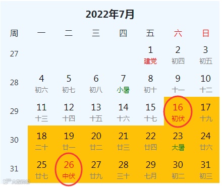 但由于“夏至”与第一个庚日之间的天数几乎每年都不一样,所以与“三庚”的天数也不是固定的。也就是说,“初伏”和“末伏”都是10天,但“中伏”天数则不固定。当夏至与立秋之间出现4个庚日时中伏为10天,出现5个庚日则为20天,所以“中伏”到“末伏”有时为10天,有时为20天。