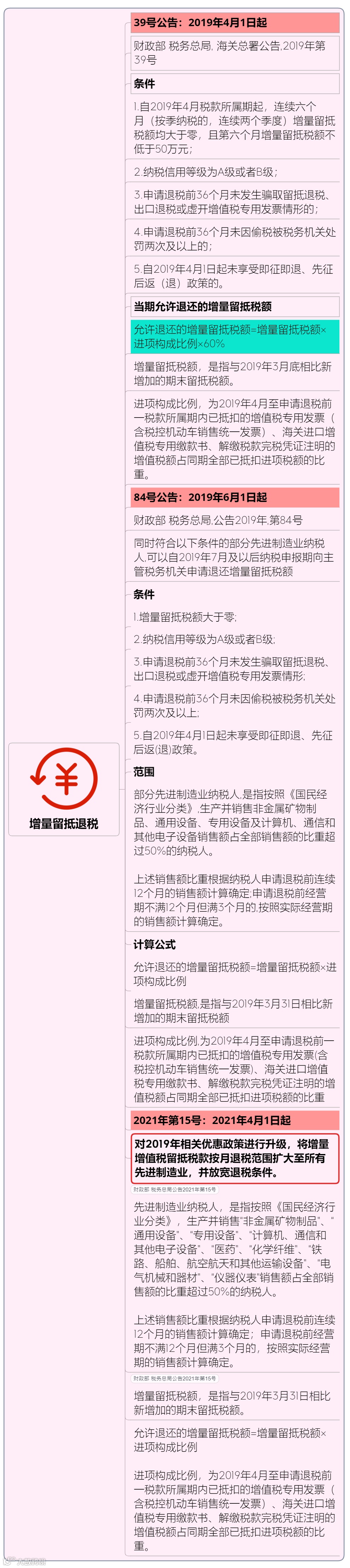 2021年4月29日,《财政部 税务总局关于明确先进制造业增值税期末留抵退税政策的公告》明确,对2019年相关优惠政策进行升级,将增量增值税留抵税款按月退税范围扩大至所有先进制造业,并放宽退税条件,此举可以增加先进制造业企业现金流,缓解资金压力,减轻企业负担。此前这一优惠政策仅限于非金属矿物制品、通用设备、专用设备、计算机通信和其他电子设备等4大类先进制造业行业,而此次《公告》新增了5大类行业,一共涵盖了9大类先进制造业行业。