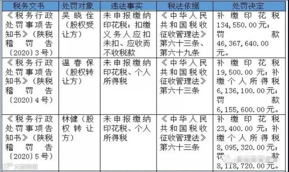 2020年9月23日,国家税务总局陕西省税务局网站连发八个税务行政处罚事项告知书,对吴晓佺与肖同春、林健、繆晓权、张树元、吴宜雄、徐守雄、温春保7人就“西安华东万和城项目”股权转让过程中签订阴阳合同逃避税款的行为拟对八人作出补缴印花税、个人所得税、罚款合计1.39亿元的税务行政处罚。